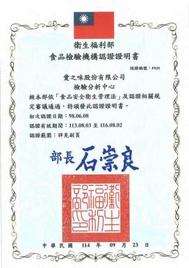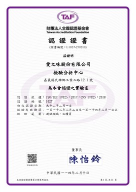 自1990年至今,實驗室已累積30年的食品分析經驗,並在2003年即取得財團法人全國認證基金會「中華民國實驗室認證(CNLA-TAF) 體系」及2009年取得衛生福利部食品藥物管理署「食品衛生委託檢驗機構」認證,是國內食品業界檢驗分析與ISO 17025 認證範疇中的領導者。